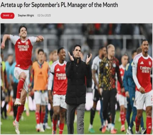 官方:阿尔特塔被提名为了英超9月份最佳主帅候选。