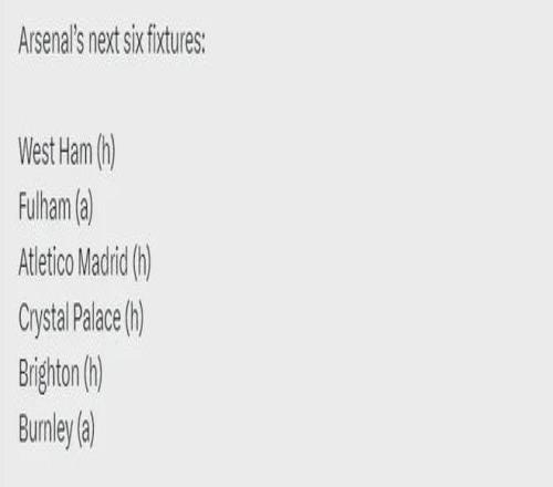 阿森纳未来6场比赛:主战西汉姆、客战富勒姆、主战马竞、主战水晶宫、主战布莱顿、客战伯恩利。