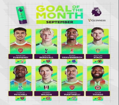 祖比门迪对诺丁汉森林一战中的凌空破门和马丁内利对曼城比赛中的绝平进球被提名为了英超9月份最佳进球候选。