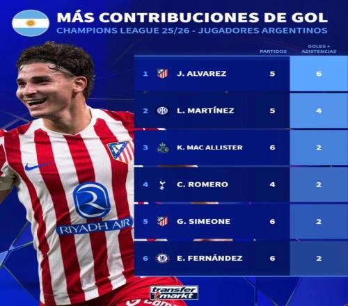 德转列出本赛季阿根廷球员欧冠参与进球榜,马竞前锋阿尔瓦雷斯6粒居首,国米前锋劳塔罗4粒排第二。