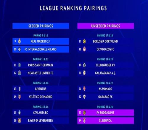 以此类推,排名相邻的高顺位球队将与排名相邻的低顺位球队通过抽签配对。