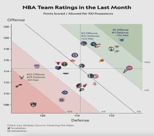 作为对比,联盟第一的雷霆在2026年战绩是11胜8负,东部第一的活塞在2026年的战绩是13胜5负。再看一组数据:过去一个月黄蜂的进攻效率联盟第一,防守效率联盟第三,净效率也是联盟第一。没有什么征兆,黄蜂突然崛起了。