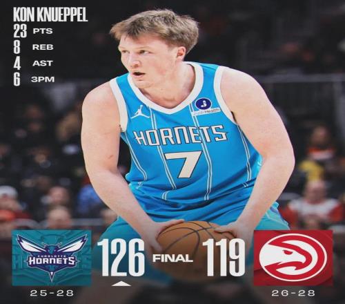 今天这场比赛,黄蜂4号秀克尼佩尔投篮15中8,三分11中6,罚球1中1,得到23分8篮板4助攻,正负值+12全队第二高。最近5场比赛,克尼佩尔场均22.2分6.2板3助,投篮命中率51.5%,三分命中率47.7%,罚球命中率90.9%!